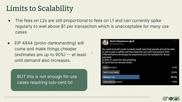 Martin Köppelmann 认为 L2 峰值 Gas 太高了,有时会到 $1 以上,即使 EIP4844 落实,Gas 能降低 90% ,但依旧有两方面问题:它对于需要 Gas 在 1 美分以下(sbu-cent)的场景依旧不适用;需求增加后 Gas 依旧会升高。