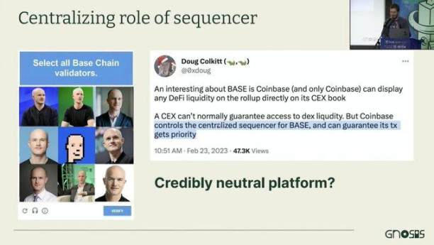 比如 L2 虽然没法拿走你的钱,但是他们有巨大的权力——可以决定是否接受你的交易、收你多少 Gas 费以及谁在前谁在后。Martin 还顺道黑了一下 Coinbase,说如果你要在 Base 上做交易所,它可以很轻松地把来自它的交易排在你的交易前面。