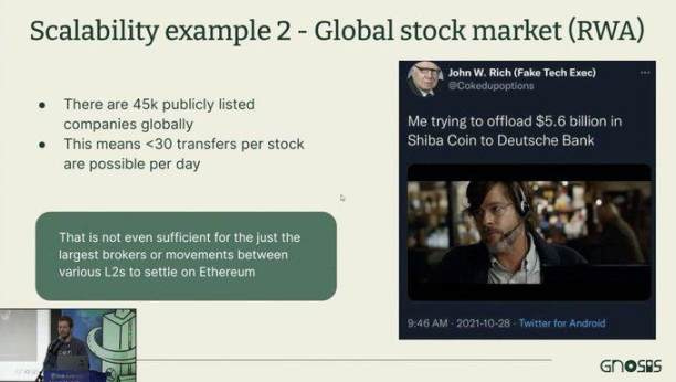 以股票为例,假如全世界的股票(4.5 万只),都用以太坊做结算层,即使用了 L2,那么每个股票每天只能进行不到 30 笔交易。甚至不足以让其中最大的经纪商或各种 L2 之间的转账在以太坊上结算。