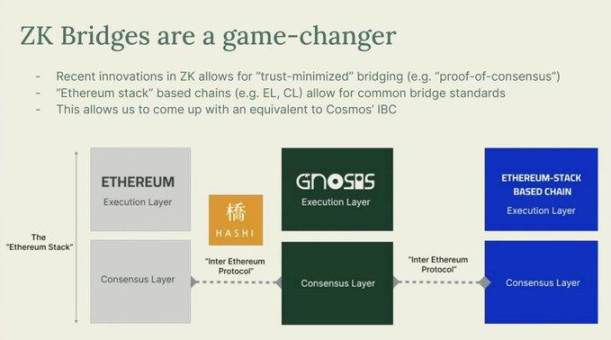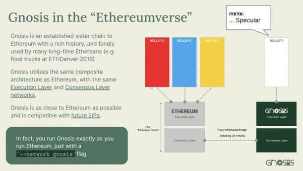 Martin Köppelmann 认为 L2 虽然有可取之处,但我们需要更多的 L1,因此提出来类似于 Cosmos 的 IBC 模型,计划再做另一个侧链和以太坊运行一样的内容,然后通过无信任的 ZK-bridge 来连接,组成一个以太坊宇宙(Ethereumverse)。