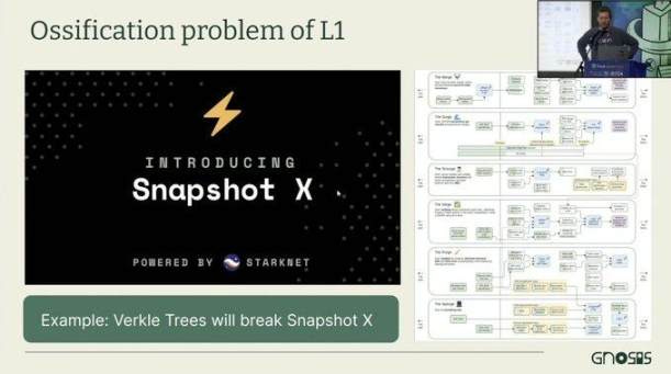 Martin Köppelmann 举了个例子来论证:我们用来投票的 Snapshot 就是在 L2 进行投票,然后将状态同步回 L1,它们在 L2 做 Merkle Proof(默克尔证明)。然而以太坊 L1 计划在未来一两年内从 Merkle Trees 切换到 Verkle Trees (维克尔树),这会导致当前版本的 Snapshot 不能再使用。因此,L2 可能需要某种「升级」机制,但这也会与其无需信任目标相矛盾。