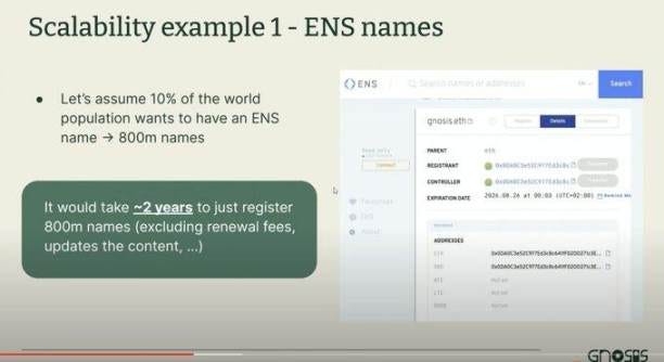 以 ENS 为例,假如全球 80 亿人口中有 10%(8 亿人)要注册 ENS,整个以太坊的交易处理能力都将被用来处理这些请求的话,需要 2 年的时间才能完成。在这 2 年中,以太坊将无法处理其他任何交易。