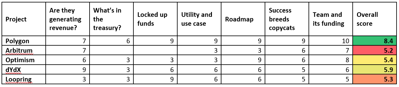 根据我的研究和分析,我给每个项目的每个类别都打了一个分数(1-10分),如你所见,Polygon 是明显的赢家。