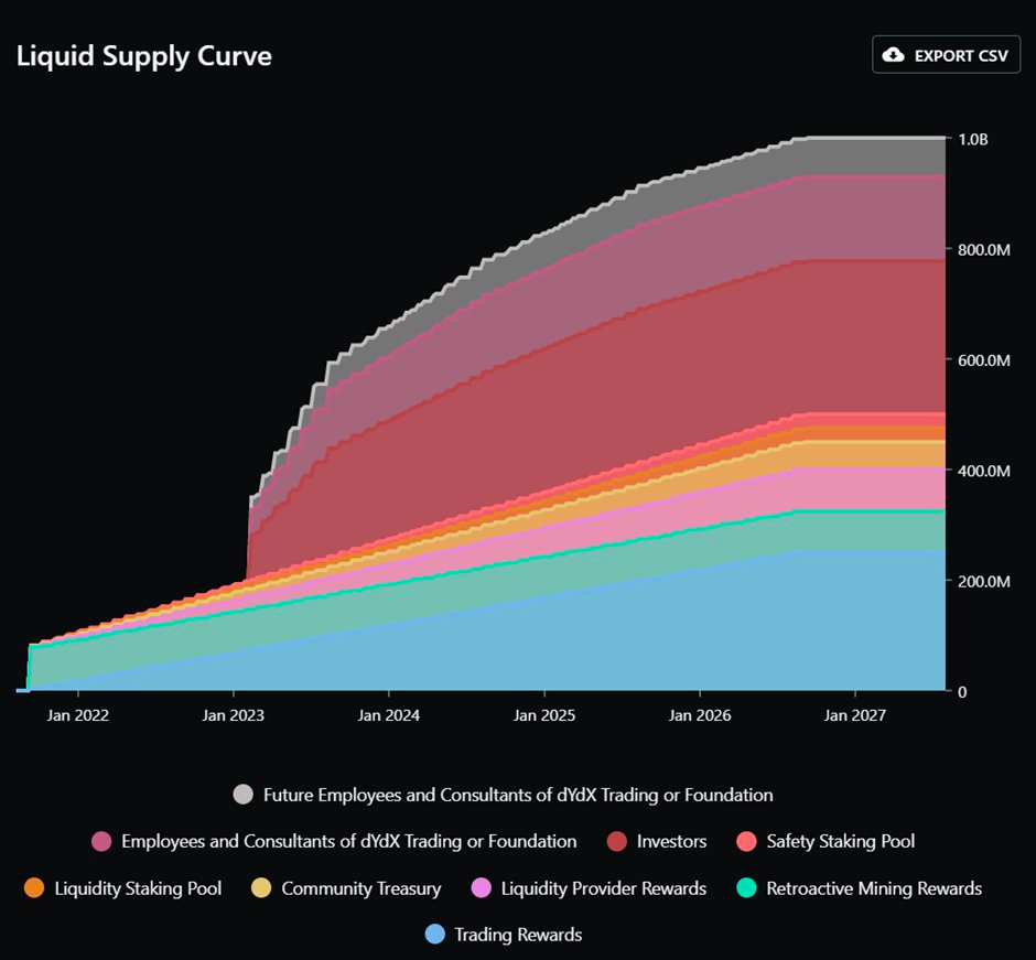 dYdX:大约 11% 的 DYDX 供应已经解锁,当前流通量大约是 10亿 DYDX 总供应量中的 1.12 亿。
