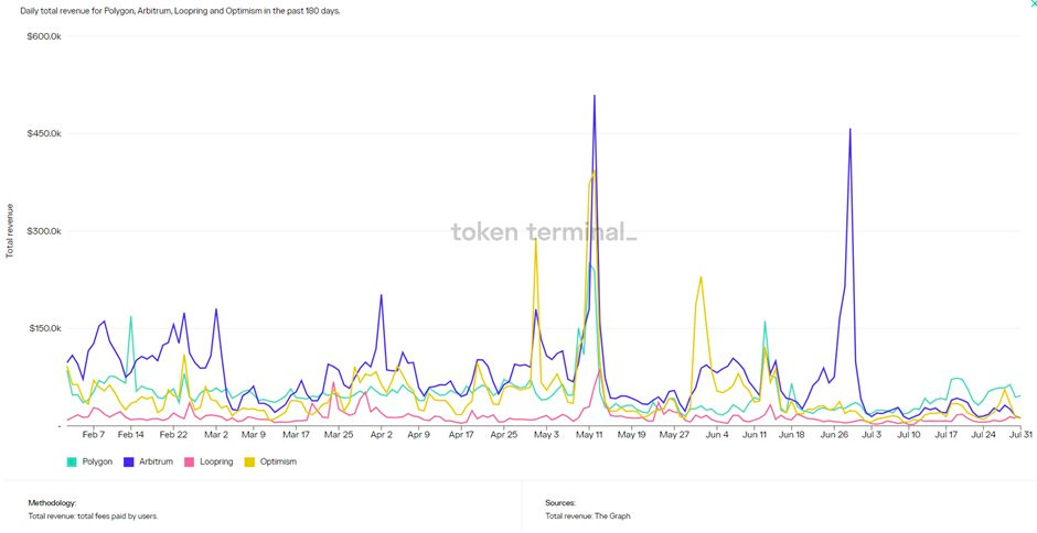 Token terminal 提供了一些非常有趣的统计数据,在过去180天内,这些 L2 项目的协议总收入(费用)情况如下:
