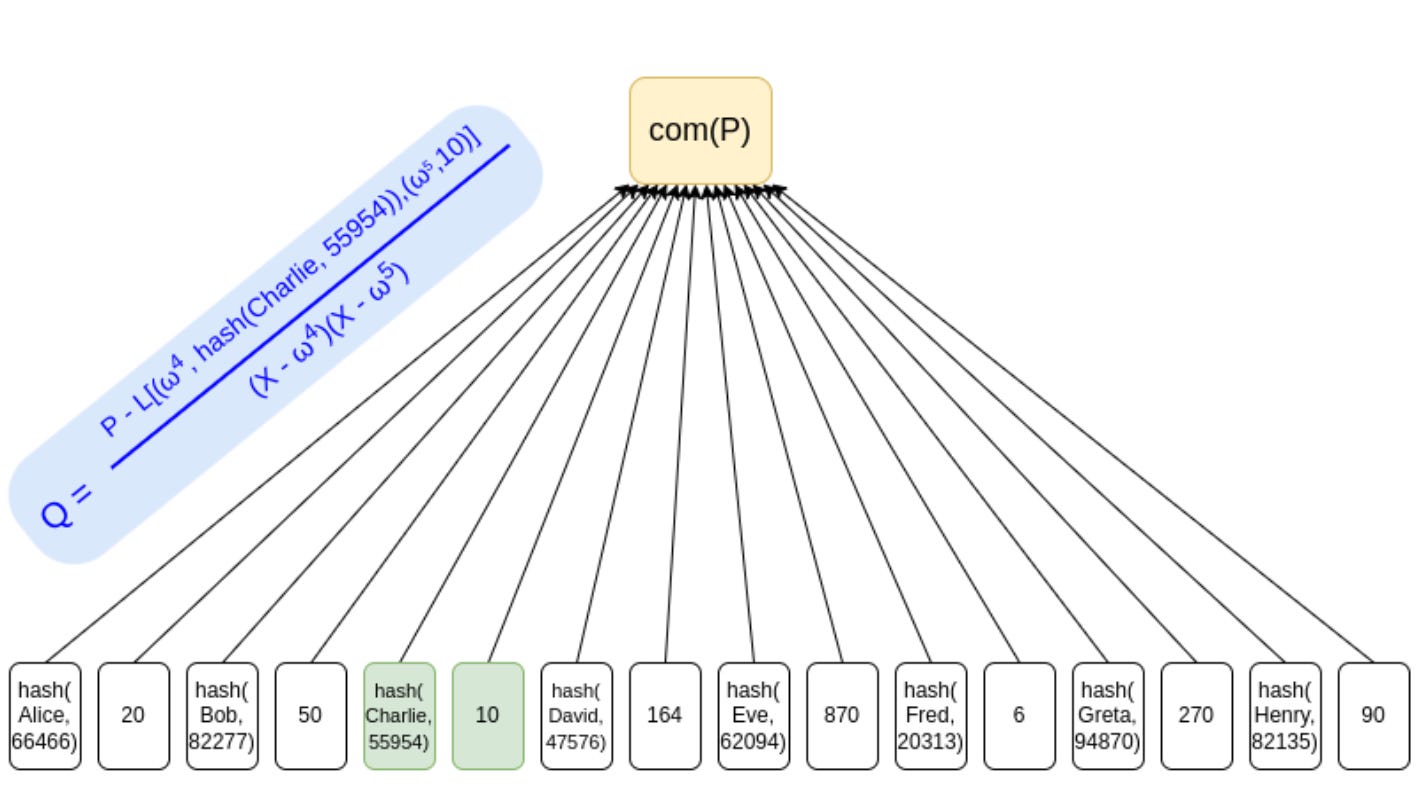 我们能做的最简单的事情就是将所有用户的存款放入一棵默克尔树(或者,更简单的,一个 KZG 承诺),并使用一个 ZK-SNARK 来证明树中的所有余额都是非负的,并且加起来是某个声称的值。如果我们为隐私添加一层哈希,则提供给每个用户的默克尔分支(或 KZG 证明)将不会透露任何其他用户的余额。