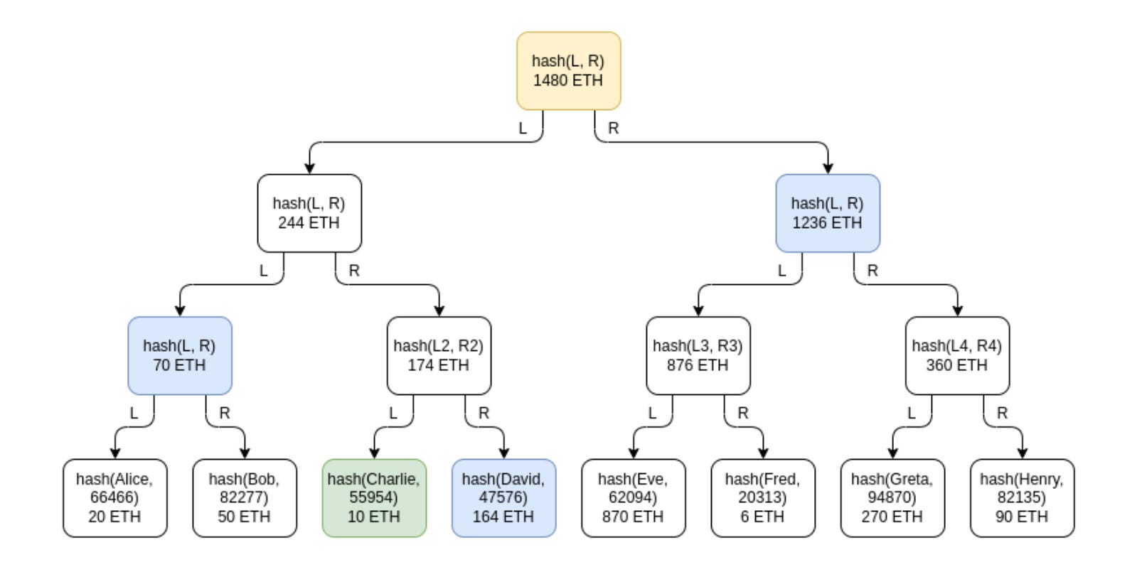 绿色:查理的节点。 蓝色:查理将收到的节点作为他证明的一部分。 黄色:根节点,公开给大家看。