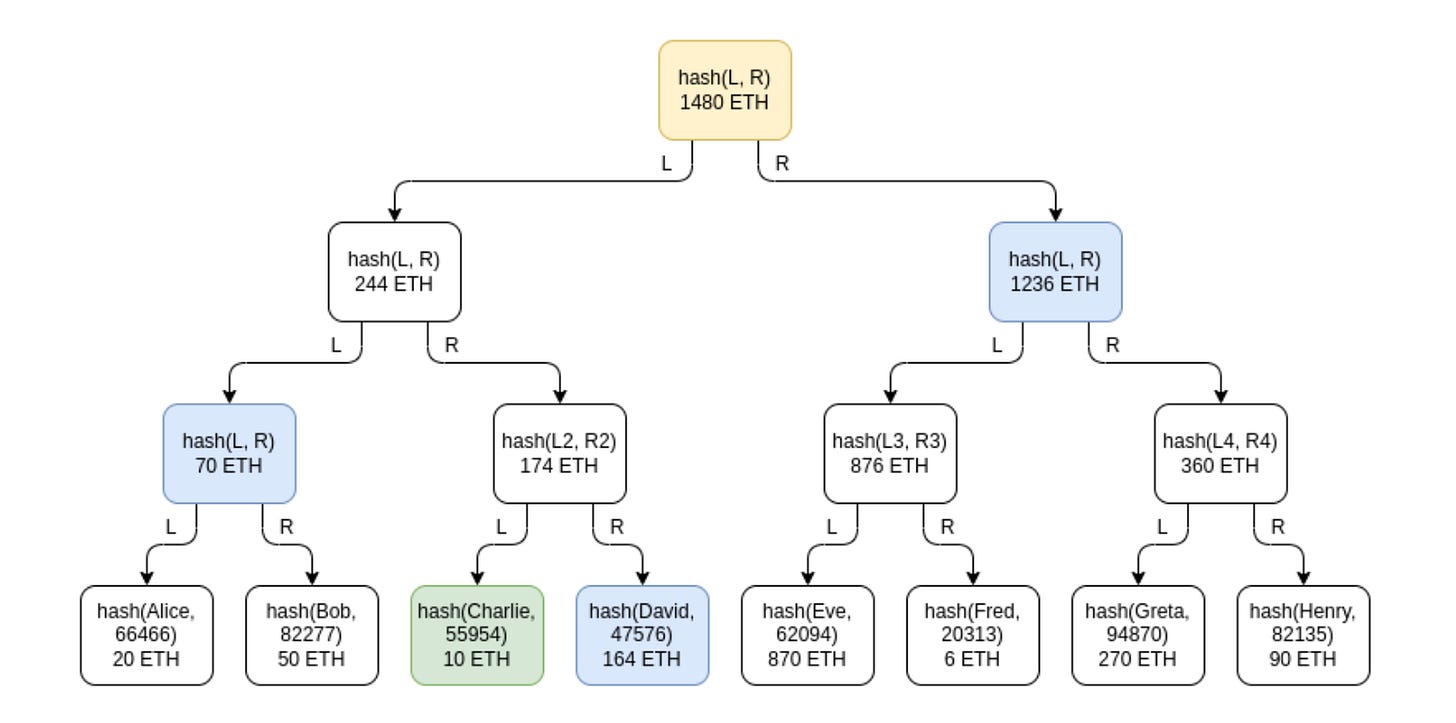 # The function for computing a parent node given two child nodesdef combine_tree_nodes(L, R): L_hash, L_balance = L R_hash, R_balance = R assert L_balance >= 0 and R_balance >= 0 new_node_hash = hash( L_hash + L_balance.to_bytes(32, 'big') + R_hash + R_balance.to_bytes(32, 'big') ) return (new_node_hash, L_balance + R_balance)# Builds a full Merkle tree. Stored in flattened form where# node i is the parent of nodes 2i and 2i+1def build_merkle_sum_tree(user_table: "List[(username, salt, balance)]"): tree_size = get_next_power_of_2(len(user_table)) tree = ( [None] * tree_size + [userdata_to_leaf(*user) for user in user_table] + [EMPTY_LEAF for _ in range(tree_size - len(user_table))] ) for i in range(tree_size - 1, 0, -1): tree[i] = combine_tree_nodes(tree[i*2], tree[i*2+1]) return tree# Root of a tree is stored at index 1 in the flattened formdef get_root(tree): return tree[1]# Gets a proof for a node at a particular indexdef get_proof(tree, index): branch_length = log2(len(tree)) - 1 # ^ = bitwise xor, x ^ 1 = sister node of x index_in_tree = index + len(tree) // 2 return [tree[(index_in_tree // 2**i) ^ 1] for i in range(branch_length)]# Verifies a proof (duh)def verify_proof(username, salt, balance, index, user_table_size, root, proof): leaf = userdata_to_leaf(username, salt, balance) branch_length = log2(get_next_power_of_2(user_table_size)) - 1 for i in range(branch_length): if index & (2**i): leaf = combine_tree_nodes(proof[i], leaf) else: leaf = combine_tree_nodes(leaf, proof[i]) return leaf == root这种设计中的隐私泄漏比完全公开的列表要低得多,并且可以通过每次发布根(root)时重新洗牌来进一步减少,但仍然存在一些隐私泄漏:Charlie 得知某人有 164 ETH 的余额 ,有两个用户的余额加起来达到 70 ETH,等等。控制许多帐户的攻击者仍然可能了解有关交易所用户的大量信息。