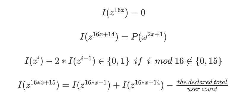 我们可以用一个专用的 ZK-SNARK 来证明上述 KZG 中余额的和以及非负性。这里有一个简单的例子,我们引入一个辅助多项式 I(x),它“建立了每个余额的位”(为了举例,我们假设余额低于 2^15)并且每第 16 个位置跟踪一个带有偏移量的累计,只有当实际的总和与声明的总和相匹配时,它的总和才为零。 如果 z 是单位的 128 阶根,我们可以证明以下方程: