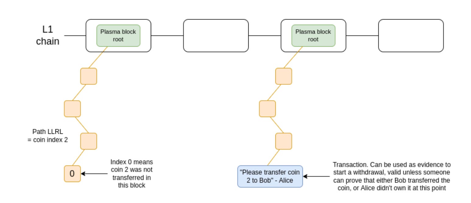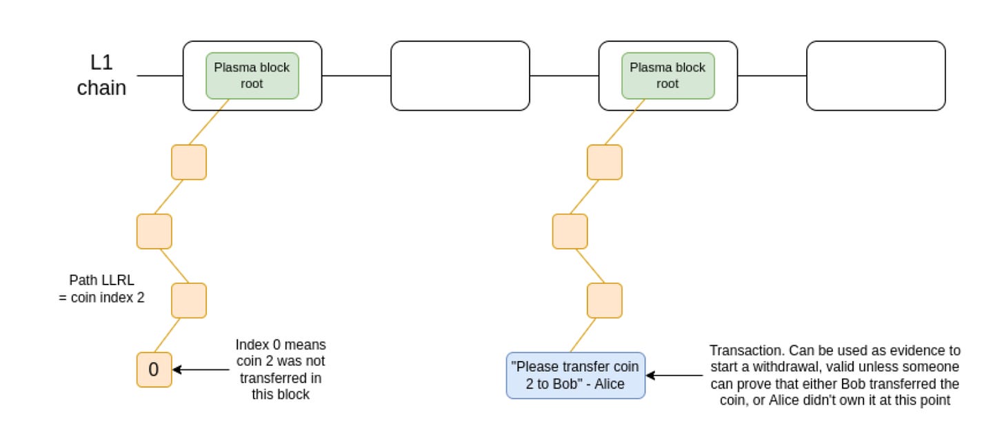 这方面的第一个主要尝试是 Plasma,这是一种在 2017 年和 2018 年在以太坊研究圈流行的扩容解决方案。Plasma 的工作原理是将余额分成一组单独的“币”,其中每个币都被分配一个索引,并存在于 Plasma 区块的默克尔树中的特定位置。要进行有效的代币转移,需要将交易放入树的正确位置(根被发布到链上)。