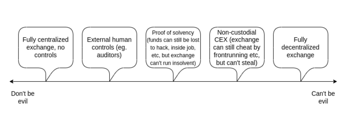 更雄心勃勃的是,交易所可以建立一个系统,在未经存款人同意的情况下,它根本无法提取存款人的资金。潜在地,我们可以探索“不作恶”(don't be evil)有抱负的好人 CEX 和“无法作恶”(can't be evil),但目前效率低下、泄露隐私的链上 DEX 之间的整个光谱。这篇文章将探讨使交易所向无需信任更近一步或两步的尝试的历史,这些技术的局限性,以及一些依赖 ZK-SNARKs 和其他先进技术的更新和更强大的想法。