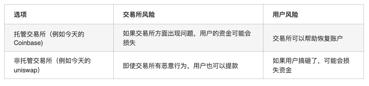 理想的长期解决方案是依靠自我保管,并借助诸如多重签名和社交恢复钱包等技术来帮助用户处理紧急情况。但在短期内,有两种明显的替代方案,它们的成本和收益明显不同: