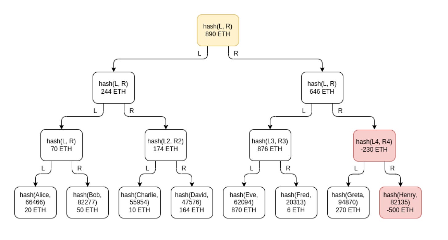 Greta 的证明验证将会失败:交易所必须给 Henry 的 -500 ETH 节点,她会认为该节点无效而拒绝。 Eve 和 Fred 的证明验证也会失败,因为 Henry 上面的中间节点总共有 -230 ETH,所以也是无效的!为了逃脱盗窃的惩罚,交易所必须希望整个树的右半部分都没有人检查他们的余额证明。