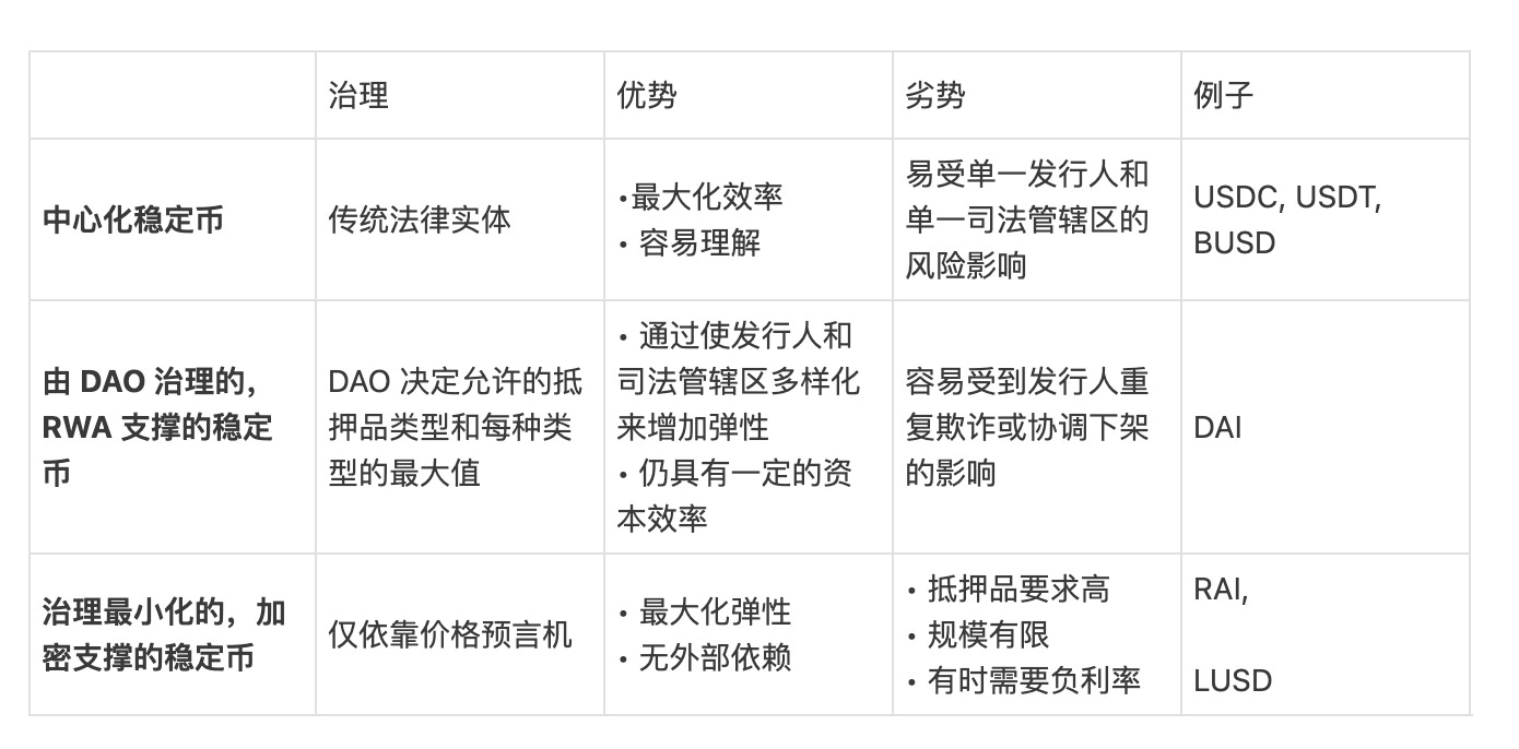 我认为稳定币的设计基本上分为三个不同的类别:中心化稳定币、DAO 管理的真实世界资产(RWA)支撑的稳定币和治理最小化的加密支持的稳定币。