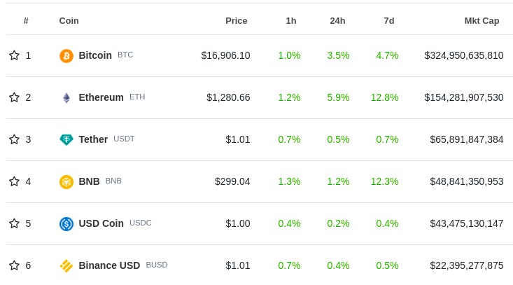 顶级加密货币市值,来自 CoinGecko 的数据,2022-11-30。前六名中的三个是中心化稳定币。