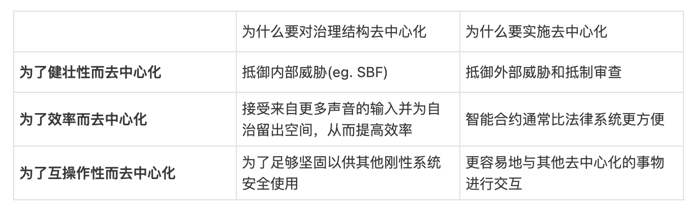 这意味着一种不同的去中心化方式。为稳健而去中心化的治理强调拥有大量决策者以确保与预设目标保持一致,并有意使调整更加困难。为提高效率而去中心化的治理保留了快速行动和在需要时进行调整的能力,但试图将决策从高层移开,以避免组织成为僵化的官僚机构。